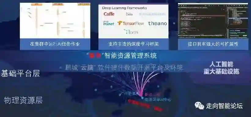目前支持平台运营的是云脑开源平台与智能应用场景,是深圳鹏城实验室提供的一个大规模系统,上面提到的资源管理系统还可以把更多地方,比如北京、合肥等的硬件设施利用起来,使训练能力更高,可以做更多事情。