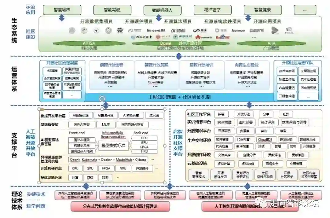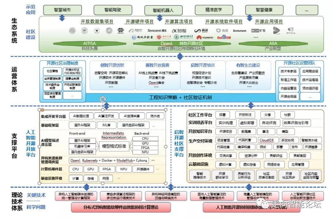 未来我们希望它就像一个城市,是一个很大的——人工智能从基础理论算法到支撑平台 ( 见下图 ),可以用社区提供的硬件平台,也可以自己做系统,包括生态环境都可以建立起来。
