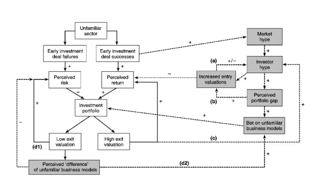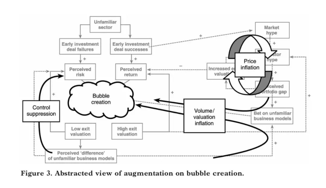 这张图概括了泡沫期投资人的认知模型。这张图左侧是投资人的微观行为,右侧则是市场趋势。