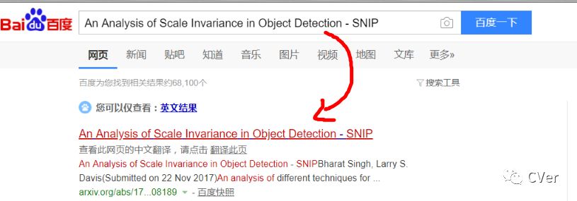 然后将需要阅读的论文标题复制到 google/baidu 搜索框中,比如《An Analysis of Scale Invariance in Object Detection - SNIP》