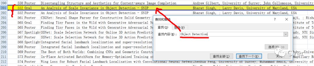 打开 cvpr2018-paper-list.csv,按下 crtl + F,输入要查找的内容,如 Object Detection,然后你就可以看到一篇篇关于 Object Detection 的论文啦!