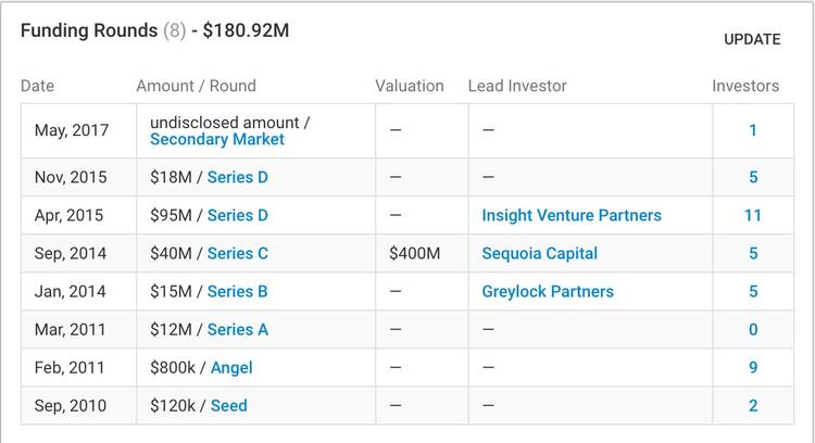 预计在 2017 年 8 月底前,Docker 公司将会完成新一轮 7500 万美元的融资,这将有助于推进该公司最新推出的赢取商业客户行动,并最终从公司被全球范围内开发人员广为使用的开源工具中获利。据透露,部分资金将用于组建一支 2B 的营销和销售团队,专门服务企业客户。Docker 公司的上一轮融资是在 2015 年,当时估值 10 亿美金。下图是 CrunchBase 上汇总的 Docker 公司融资信息。
