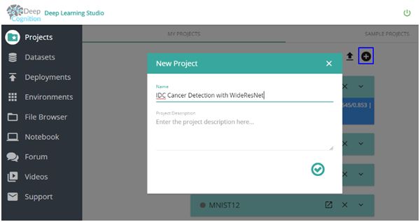 登录到本地或云端运行的 Deep Learning Studio 后,点击+按钮,即可创建一个新项目。