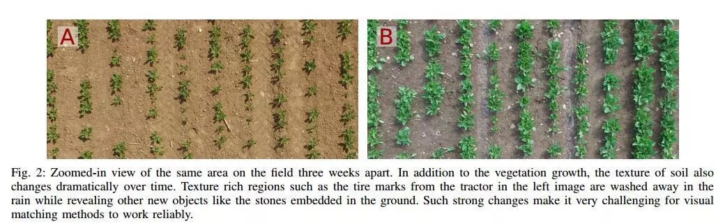 图2 三周之后放大了对场地同一区域的视野。 除了植被生长,土壤质地也随着时间的推移而发生显着变化。 纹理丰富的区域,例如左图中拖拉机的轮胎标记,在雨中被冲走,同时露出其他新物体,如嵌入地面的石头。 如此强烈的变化使得视觉匹配方法可靠地工作非常具有挑战性。