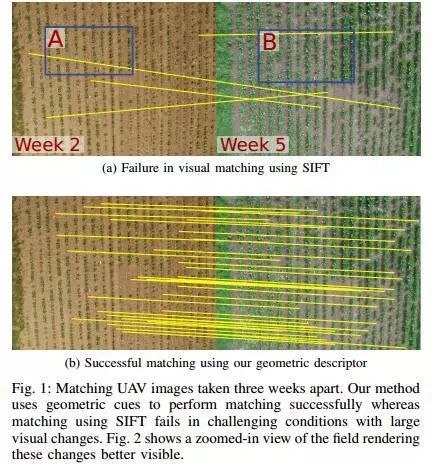 图1 a图匹配了三个星期相隔的无人机图像。 我们的方法使用几何线索成功执行匹配,而使用SIFT进行匹配在具有大视觉变化的挑战条件下失败。 b图显示了字段的放大视图,使这些更改更加清晰可见。