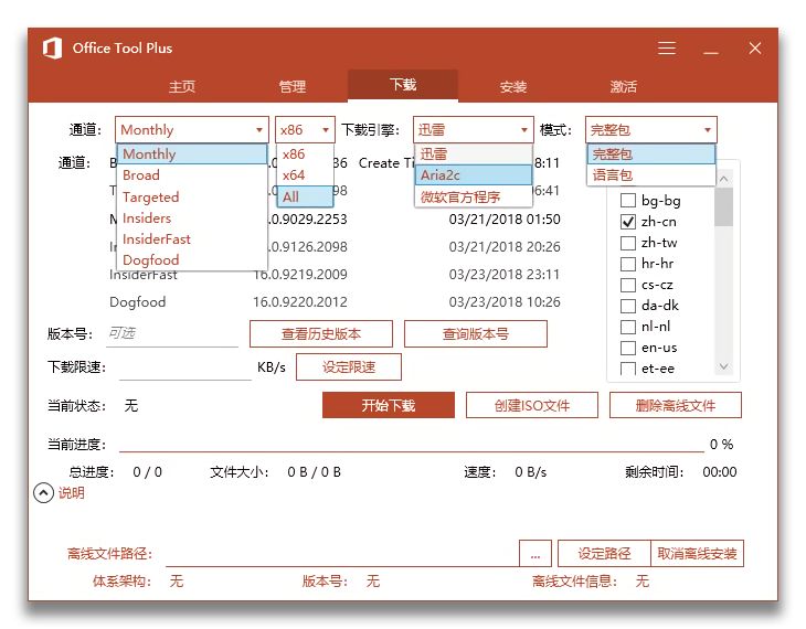 Office 套件目前共有 5 个通道,推荐办公人士使用 Board 稳定通道防止影响工作。工具还提供迅雷下载、Aria2 及微软官方下载器下载,同时为了避免影响下载时的正常工作,可以将速度进行限制,当下载完成后软件还会自动读取离线安装包所在目录。