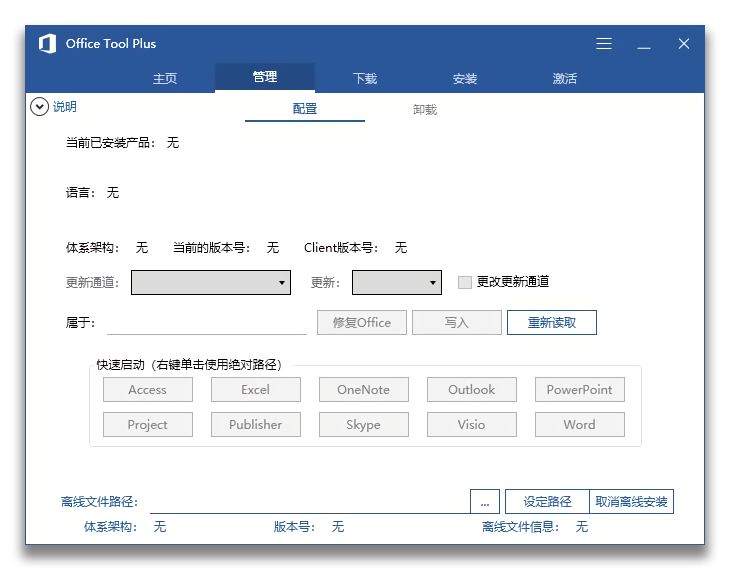 通过 OTP,你可以查看当前电脑中安装的 Office 的信息,配置当前 Office 的更新。还可以一次性卸载多个版本的 Office,删除某个语言包。