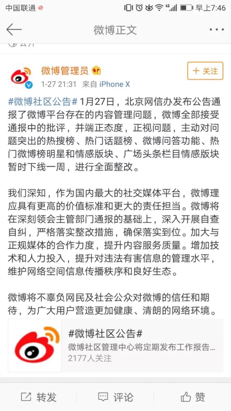 按照要求,新浪微博对问题突出的热搜榜、热门话题榜、微博问答功能、热门微博榜明星和情感版块、广场头条栏目情感版块将从今天开始下架,持续1周时间。