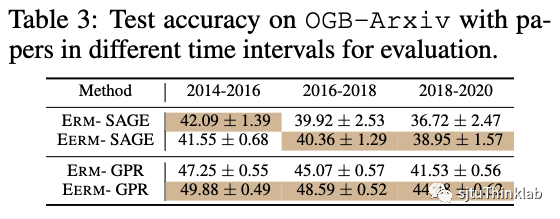 接着我们考虑第二种情况,随着时间的推移,图中的节点和连边会发生变化。这里我们考虑OGBN-Arxiv数据集,其中每个节点是论文。我们按论文的发表时间将节点分为训练集和测试集。为了引入分布偏移,我们扩大训练节点和测试节点的时间间隔:使用2011前发表的论文作为训练集,2011-2014年发表的论文作为验证集,2014年之后的为测试集。下表展示了时间在2014-2016/2016-2018/2018-2020年的测试节点上的测试准确率。可以看到,随着时间的推移(分布偏移进一步扩大),模型的性能都呈现下降趋势,但ERM的下降趋势更为明显。这也说明,EERM能够有效提升模型对分布偏移的鲁棒性。