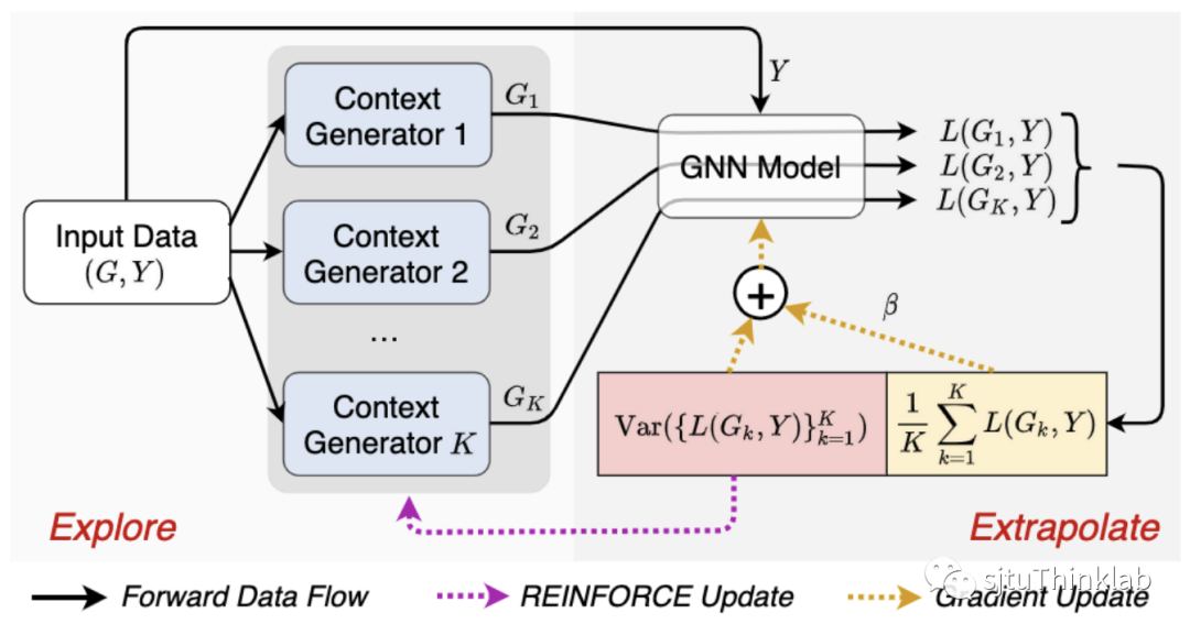 这里我们定义每个图数据所对应的损失函数。针对数据生成器 ,我们将其参数化为一个图结构学习器(graph editor),即将每一条连边假设为自由参数,对输入图进行局部改变(删除或增加连边)。具体的,我们将每一个改变视为动作(action),最终使用基于策略梯度的REINFORCE算法进行优化,以解决离散动作空间采样不可导的问题。我们将本文提出的方法称为Explore-to-Extrapolation Risk Minimization(EERM),下图给出了训练过程的数据流图。