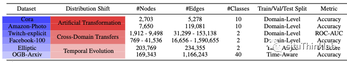 为了验证提出的方法,我们需要设计实验,测试模型在不同数据分布上的性能。真实的图数据中可能包含多种不同的分布偏移,这里我们考虑三种情况:人造混淆噪声(Artificial Transformation)、跨图领域迁移(Cross-Domain Transfer)、动态图时序泛化(Temporal Evolution)。下表展示了本文使用的6个数据集以及对应的分布偏移的形式。