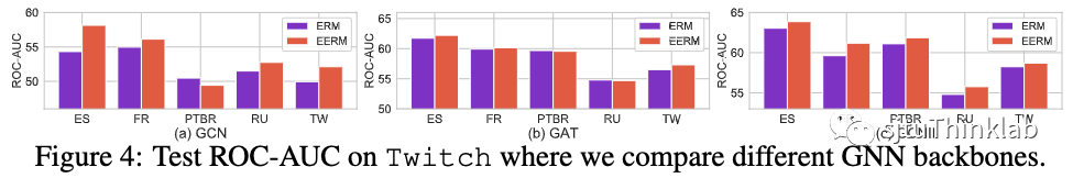 对于Twitch数据集,我们使用子图DE作为训练集,ENGB作为验证集,其余作为测试集。由于是二分类问题且类别标签不均衡,所以我们使用ROC-AUC作为评测指标。下图显示了分别使用GCN、GAT、GCNII作为网络主干,ERM与EERM在5个测试图上的性能对比。可以看到,EERM在几乎所有情况下都超越了ERM。