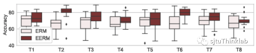 对于Facebook数据集,我们考虑使用多个图进行训练。具体的,我们考虑三种训练子图的组合。下表显示了使用不同训练子图的组合,在三个测试图(Penn,Brown,Texas)上的准确率对比。同样,EERM在绝大部分情况下超越了ERM,取得了最高7.2%的提升。