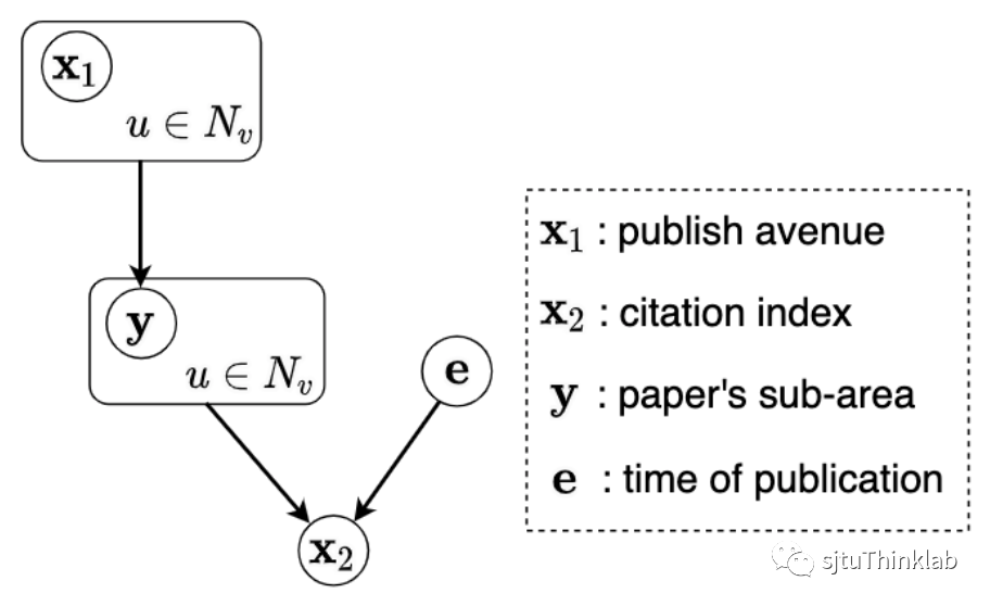 在进入技术细节之前,我们首先考虑一个具体的例子作为热身。我们考虑一个引用网络,每个节点表示一篇论文,每条连边表示论文之间的引用关系。每个节点有两个特征——论文发表的会议