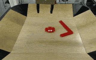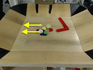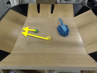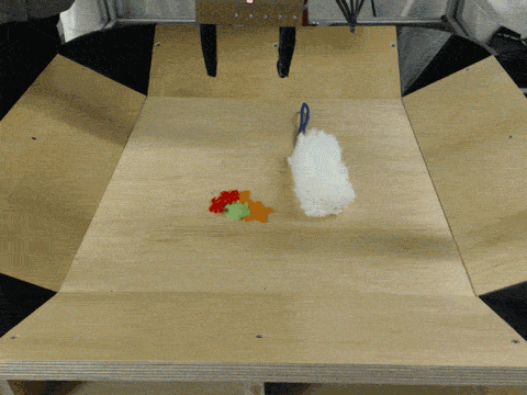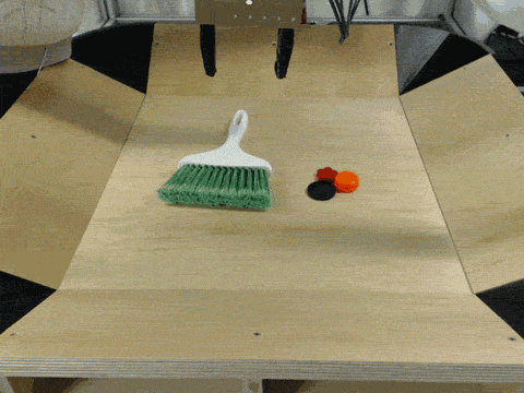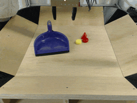 新任务的创建需要用户给定关键点的移动。比如下图中,我们希望机器人把地上的垃圾扫到簸箕中,就在图中选中垃圾的中心点,然后画出希望的最终位置。用这种方式指定任务并不会告诉机器人如何使用工具,在有多种工具可以选的环境下甚至都没有指明要用哪一种工具,机器人需要自己思考并规划。