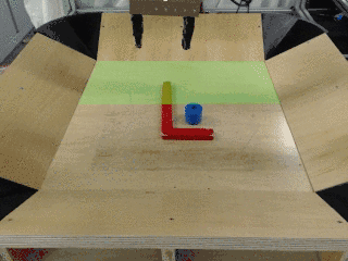在下面的例子中,作者们设定只允许机器人在绿色阴影范围内移动,目标是把蓝色圆柱体向自己的方向移动。显然,这个任务的关键就是机器人想到了如何使用 L 型的木块把圆柱体钩过来。