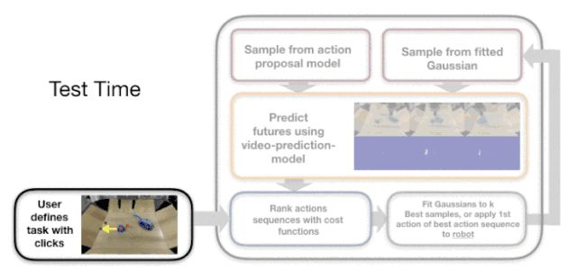 在测试时,机器人可以使用模仿学习训练的模型来指导规划过程,然后用预测模型来觉得哪些动作可以让它完成目前的任务。
