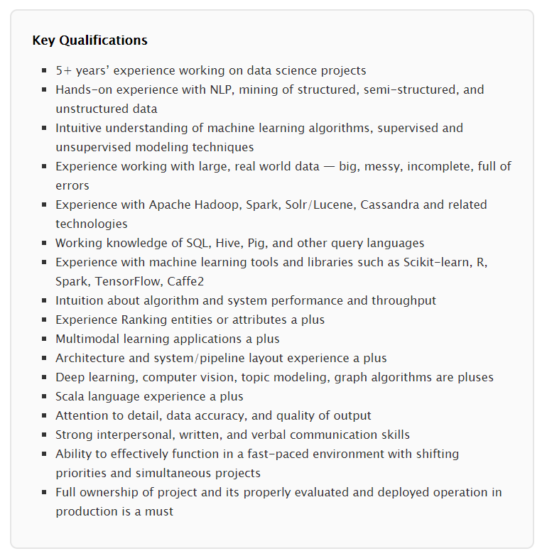 知识技能:Apache Hadoop,Spark,Solr/Lucene,Cassandra 等相关经验;熟悉 Scikit-learn,R,Tensorflow,Caffe2等