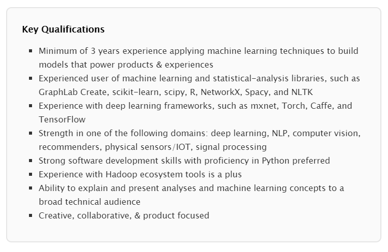 学历和工作经验:机器学习、统计学、计算机科学、物理以及相关专业的博士 + 5 年以上的机器学习研究经验;机器学习、统计学、计算机科学、物理以及相关专业的硕士 + 7 年以上的机器学习模型业界经验
