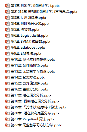 所有的课件都是 ppt 格式,总共包含 22 章。正好是《统计学习方法》第 2 版的完整内容。