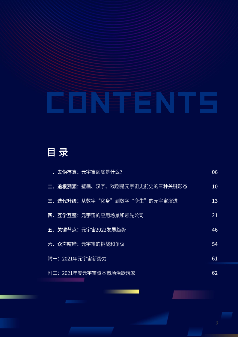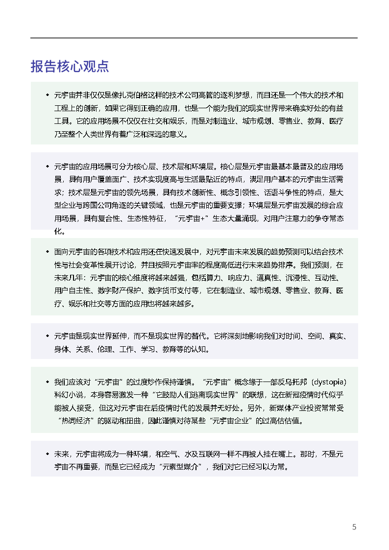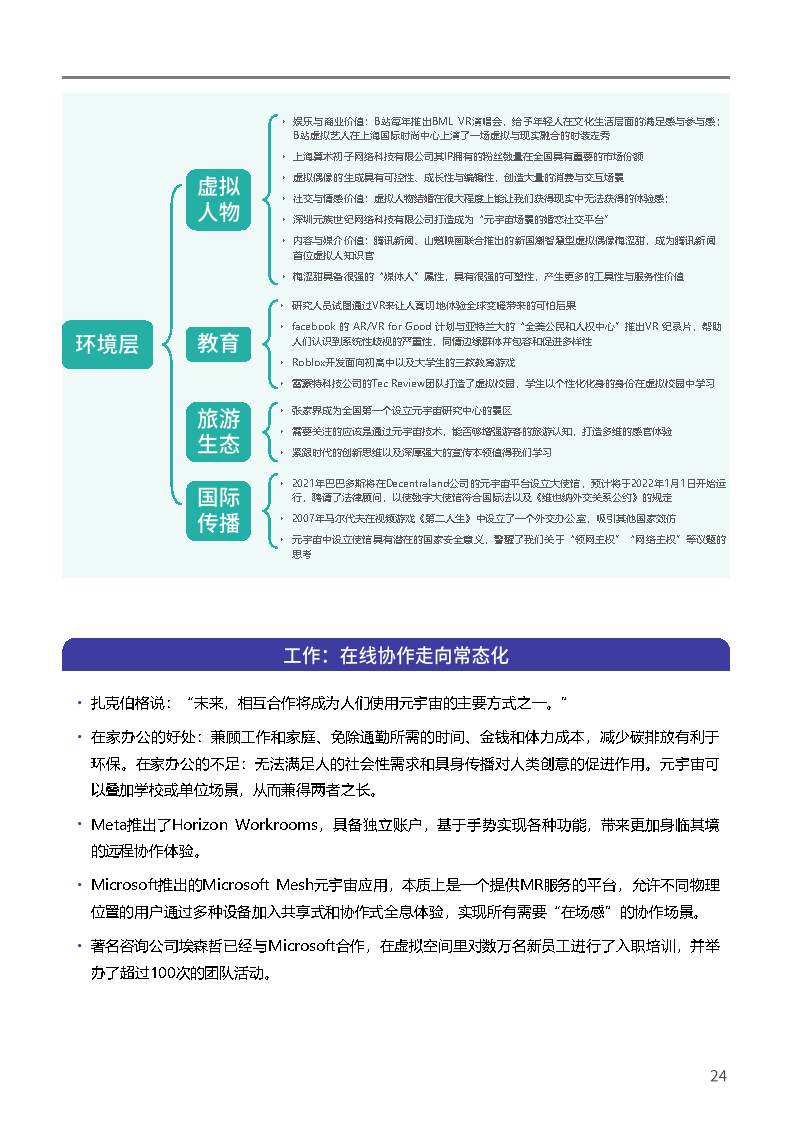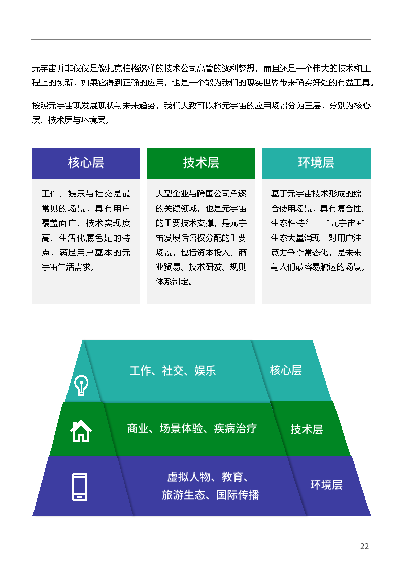 元宇宙的应用场景可分为核心层、技术层和环境层。核心层是元宇宙最基本最普及的应用场景,具有用户覆盖面广、技术实现度高与生活最贴近的特点,满足用户基本的元宇宙生活需求;技术层是元宇宙的领先场景,具有技术创新性、概念引领性、话语斗争性的特点,是大型企业与跨国公司角逐的关键领域,也是元宇由的重要支撑;环境层是元宇宙发展的综合应用场景,具有复合性、生态性特征,“元宇宙+”生态大量涌现,对用户注意力的争夺常态化。