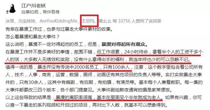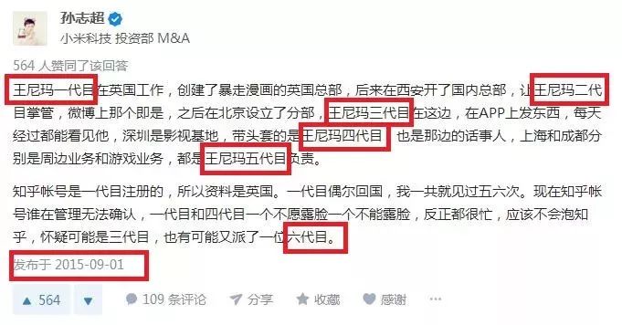 2015年9月,供职于小米投资部的知乎大V孙志超爆料,王尼玛至少有五个。第一位当然是创始人任剑,之后暴漫扩张,在西安、北京、深圳、上海等地都有扮演王尼玛的演员。