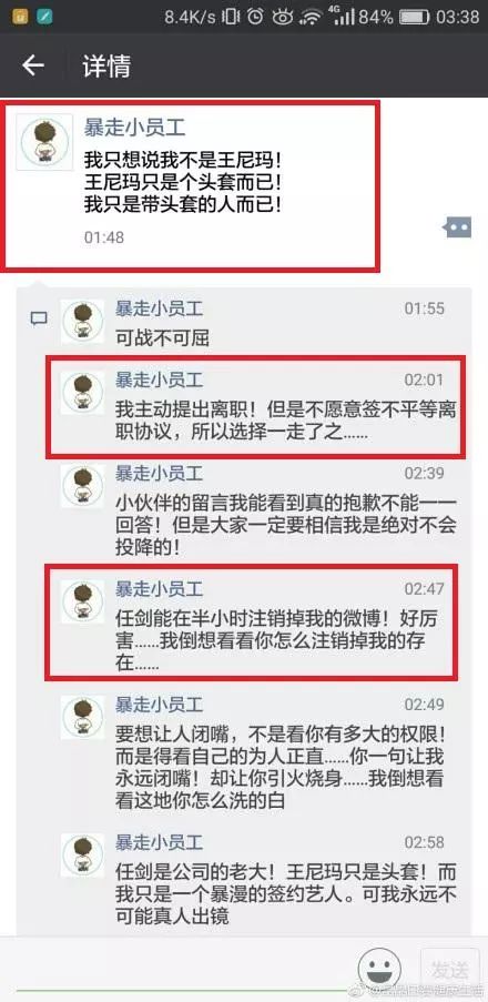 昨晚,名为“暴走小员工”(应为王尼玛的扮演者)在朋友圈发了一系列惊人的言论。