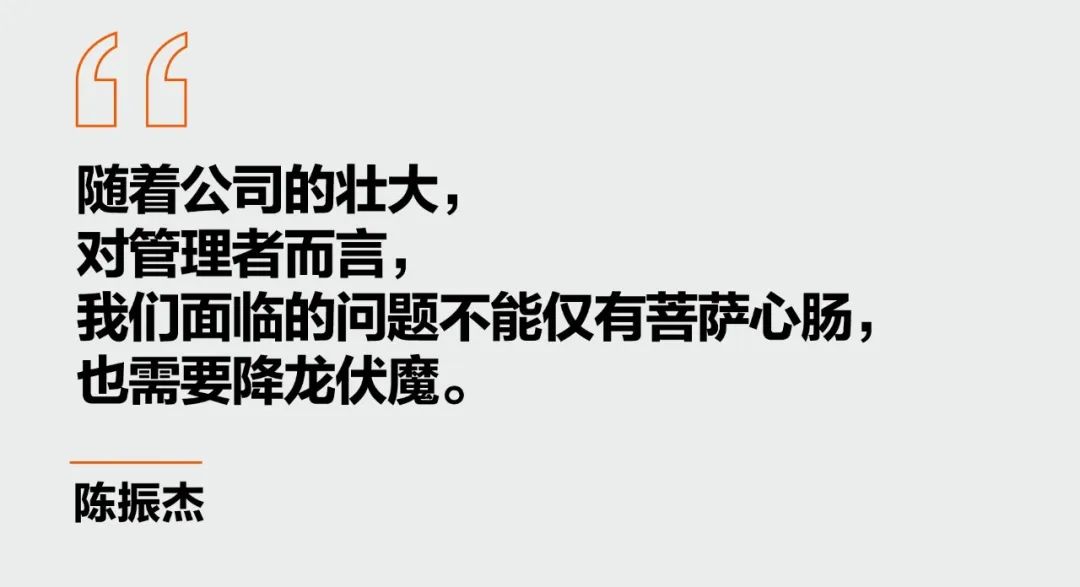 “随着公司的壮大,对管理者而言,我们面临的问题不能仅有菩萨心肠,也需要降龙伏魔。”陈振杰有感而发。