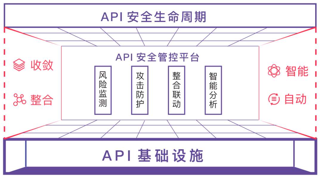 此外,由于API本身涉及到云原生通信体系在金融科技领域的各项业务,较多API可能已经在未进行安全审计的状态下,越过了设计、开发、测试阶段直接处于运行时状态。对于这一部分已经投入生产的API,最好能够建立对于API安全的管控平台。如图4所示,对已有API进行风险监测、攻击防护、联动防御和智能分析。