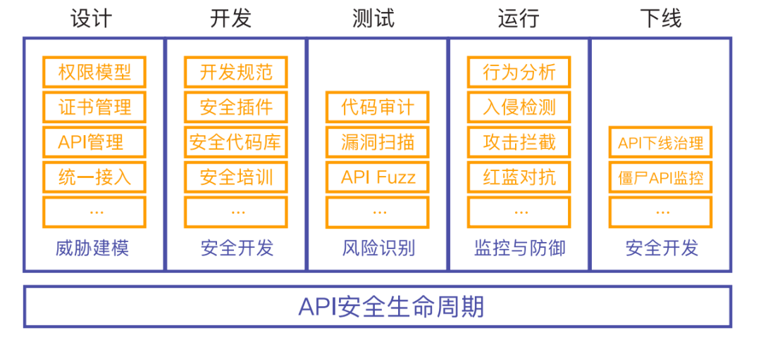 由于API的安全问题贯穿了从设计、管理到下线的全流程,因此也需要从整个API的生命周期来着手。如图3所示,表示如何在API生命周期的不同阶段落地相应的安全能力。
