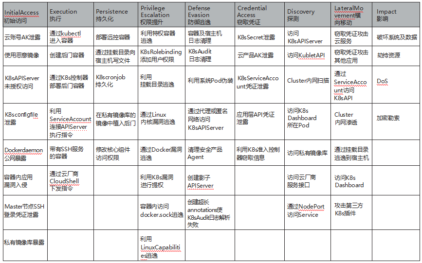 这些攻击手段分别从容器的不同暴露点位入手,结合不同的配置缺陷,窃取认证信息,以此获得持久化的控制权限,最终能够达到破坏容器集群系统及数据、劫持资源、拒绝服务和加密勒索的目的。