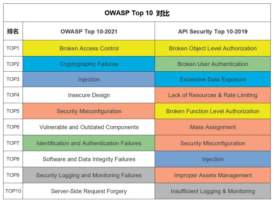 图2 OWASPTOP10-2021和OWASPAPISecurityTop10-2019的对比