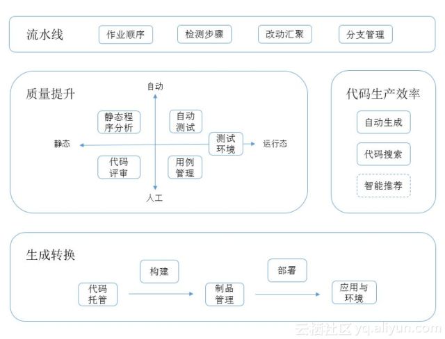再来看右半部分。右上角,是自动的对运行中的程序的检测。这也就是常说的自动测试啦。在阿里巴巴,也是主要由Aone的实验室来向大家提供相应服务。这包括单元测试/集成测试;接口测试/Web UI测试;功能测试/性能测试,等等。