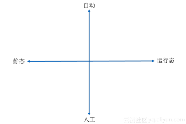 为方便梳理,我们划一个横轴,一个纵轴,然后按照得到的四个象限,梳理各种质量保证方法。这里所说的横轴,在最左边,是源代码。在最右边,是运行中的程序。这里所说的纵轴,在最上边,是自动化,在最下边,是人工。
