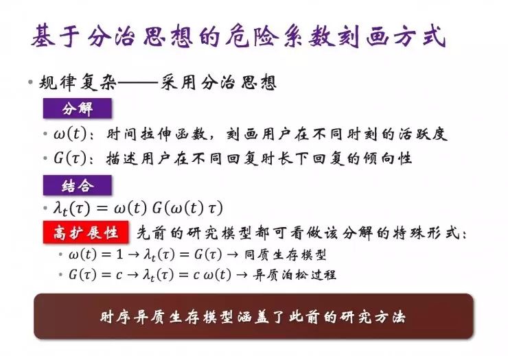 总结:本文提出了一个综合性的时序异质用户动力学生存框架,框架能够同时对用户交互行为在响应时间维度和自然时间维度的影响进行刻画。通过为框架设计的一般性分解方案,该框架涵盖了目前针对用户交互动力学行为设计的所有模型。