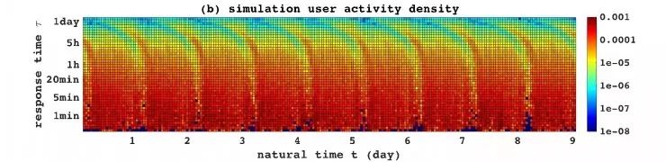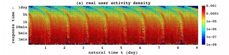 从图中可以很明显发现:随着响应时长的变化,用户的活跃度也不断发生变化。与此同时,响应时间密度函数在自然时间尺度也呈现出了周期性的变化趋势。这些现象表明,社会用户行为动力学在多重时间维度均存在异质性。尽管目前已有一些模型分别解决了用户交互行为在响应时间和人类行为昼夜变化的规律,但是这些模型均无法同时对这两个组成部分进行建模,导致在对用户交互行为进行建模和预测时产生偏差。