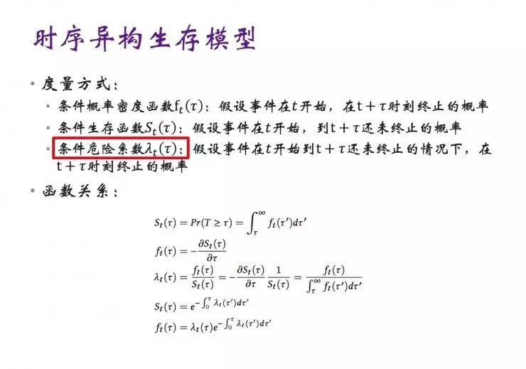 给定这三个度量指标中的任意一个,另外两个指标也可被直接确定,其中危险函数通常具有最简洁的表达形式。因此,在生存模型比较复杂的情况下,一般会采用刻画危险函数的方式进行建模。