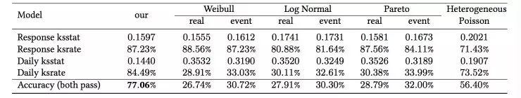 实验表明,我们的模型可以成功复现出社交交互数据集中用户的交互行为模式。从下文展示的对比图可发现,我们的模型模拟生成的结果的用户行为密度函数与真实情况是十分相似的。而在统计指标的对比中,本模型成功使得 77.1% 的数据同时通过了响应时长 KS-test 测试以及日常活跃度 KS-test 测试,准确率相较已有方法提升了 36.6%。