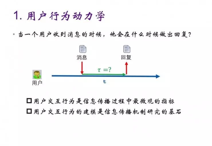 目前,学界中已尝试提出了一系列模型对用户行为动力学进行刻画。这当中,大部分模型假设了个体与个体之间的相互作用是高度随机的,遵循泊松过程。最近,一些工作在真实数据中发现,个体行为在响应时间维度(即一个人收到一个消息的时间到他做出一个响应的时间之间的持续时间)以及事件间时间维度(即同一人相邻两个行为之间的持续时间)均存在非常奇异的模式: