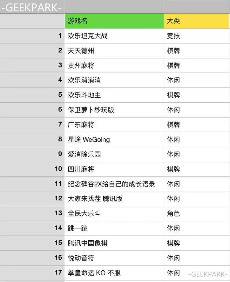 从微信首批开放的 17 个小游戏中也能看到,棋牌类、休闲类游戏占到了大多数,简单易上手,同时又能产生强社交关联,这是它们的共有特点。而唯一的竞技类游戏——欢乐坦克大战,这又是一个童年经典游戏的复刻。
