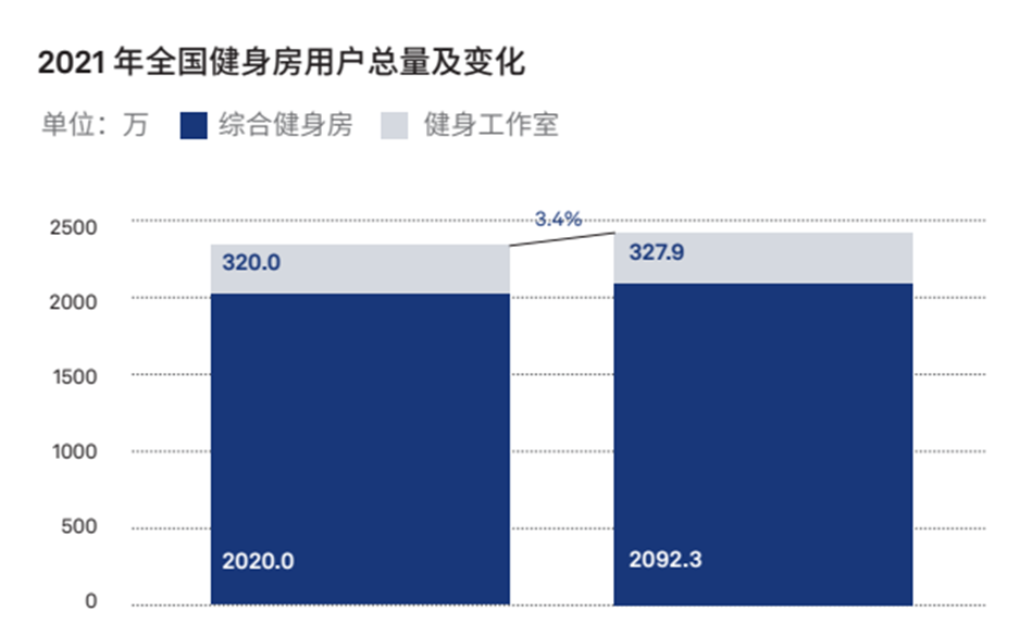 行业报告中也证明了这点。根据最新的Gymsquare《2022中国健身行业报告》(以下简称“健身报告”)显示,截至2021年12月,全国健身房活跃用户总量为2420.2万,与2020年的2340万相比,活跃健身房用户有所增加,增幅为3.4%。