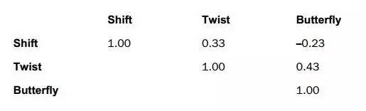 我们从债券超额收益对因子风险的横截面数据回归计算因子回报。主成分分析相当于“旋转”因子和协方差矩阵映射到协方差矩阵对角的表达式子中。通过保持只有前三个因子,我们保留主要风险来源,同时减少虚假相关的可能性。旋转矩阵基础的因子是正交的,是利率变化的加权组合。协方差矩阵的对角线元素是因子的样本内方差。我们用每月移动,扭曲和蝴蝶回报的时间序列生成3X3模型的利率风险矩阵。因子波动率(表示为一个标准差)和相关性确定利率矩阵。