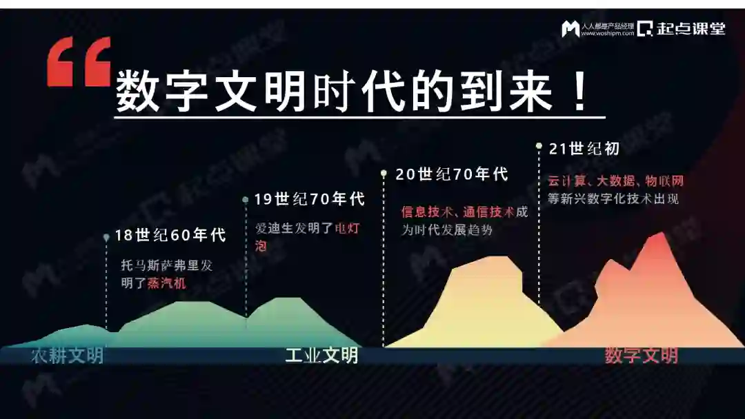 今天所看到的时代趋势就是这个样子:从最开始的农耕文明到18世纪60年代蒸汽机发明,然后到19世纪70年代工业文明电的使用,然后到20世纪70年代信息技术、通信技术成为了时代发展趋势,最后到了21世纪初云计算、大数据、物联网等的出现,我们进入了数字文明时代。