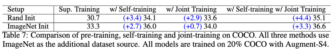 作者在实验中使用了与自训练相同的参数设置,发现ImageNet的预训练可获得+ 2.6AP的增益,但使用随机初始化和联合训练可获得+ 2.9AP的更大增益。而且,预训练、联合训练和自训练都是加性的。使用相同的ImageNet数据集,ImageNet的预训练获得+ 2.6AP的增益,预训练+联合训练再获得+ 0.7AP的增益,而预训练+联合训练+自训练则获得+ 3.3AP的增益。