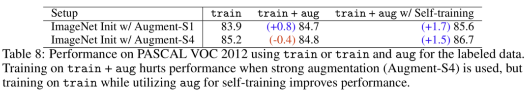 2)借助高强度的数据增强方法(Augment-S4),使用PASCAL(训练+ 增强数据集)进行训练实际上会损害准确率。同时,通过对同一数据集进行自训练而生成的伪标签可提高准确性。