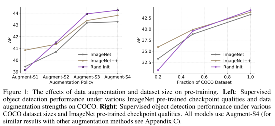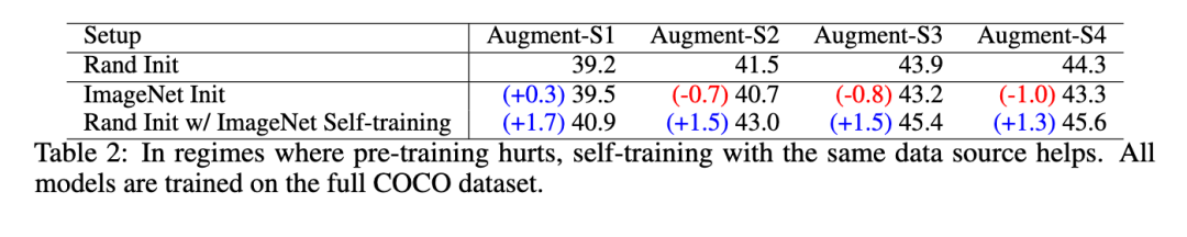 1)使用高强度的数据增强时,监督预训练会损害性能:作者注意到,当他们使用如上所述的标准增强方法Augment-S1时,预训练会对结果有所帮助。但是随着增加增强的强度,预训练并未对结果有太大帮助。实际上,他们观察到,在使用最强的数据增强(Augment-S3)时,预训练会严重损害性能。