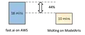 在模型训练部分,ModelArts通过硬件、软件和算法协同优化来实现训练加速。尤其在深度学习模型训练方面,华为将分布式加速层抽象出来,形成一套通用框架——MoXing(“模型”的拼音,意味着一切优化都围绕模型展开)。采用与fast.ai一样的硬件、模型和训练数据,ModelArts可将训练时长可缩短到10分钟,创造了新的记录,为用户节省44%的时间。