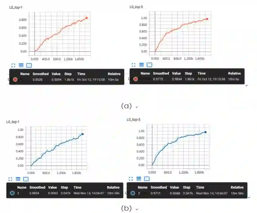 测试的模型训练收敛曲线如下图所示。此处Top-1和Top-5精度为训练集上的精度,为了达到极致的训练速度,训练过程中采用了额外进程对模型进行验证,最终验证精度如表1所示(包含与fast.ai的对比)。图(a)所对应的模型在验证集上Top-1 精度≥75%,训练耗时为10分06秒;图(b)所对应的模型在验证集上Top-5 精度≥93%,训练耗时为10分58秒。