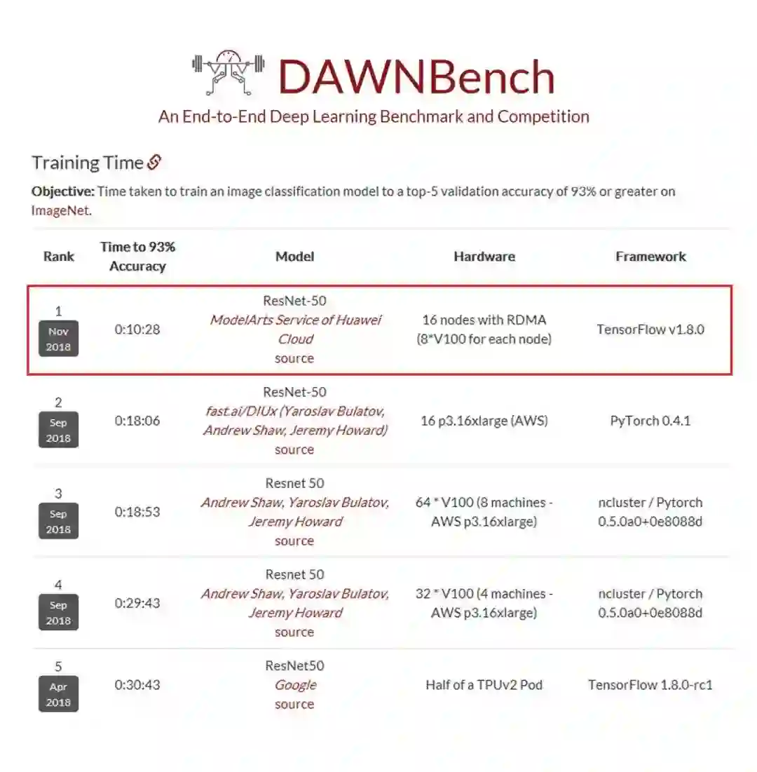 近日,斯坦福大学发布了DAWNBenchmark最新成绩,在图像识别(ResNet50-on-ImageNet,93%以上精度)的总训练时间上,华为云ModelArts排名第一,仅需10分28秒,比第二名提升近44%。成绩证明,华为云ModelArts实现了更低成本、更快速度、更极致的体验。