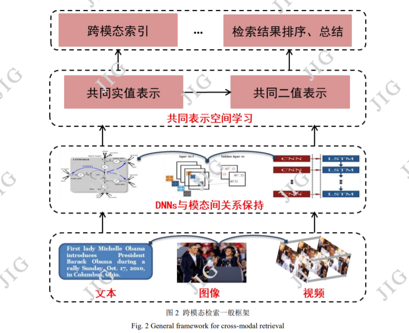 多模态数据的迅速增长使得用户很难有效地搜 索感兴趣的信息,也就衍生了各种各样的检索、搜 索技术。然而这些搜索技术大多是针对单一模态内 检索,如基于关键字的检索和基于内容的检索,它 们只执行相同媒体类型的相似性搜索,如文本检索、 图像检索、音频检索和视频检索。近些年来,移动 设备和新兴的社交网站(如 Facebook、Flickr、 YouTube 和 Twitter)的普及使得用户对跨模态数据 检索的要求越来越高。例如,用户正在游览长城, 希望通过拍照检索相关的文本、音频等材料作为指 南。通常,跨模态检索的目的是以一种模态的数据作为查询来检索相关的其它模态数据。
